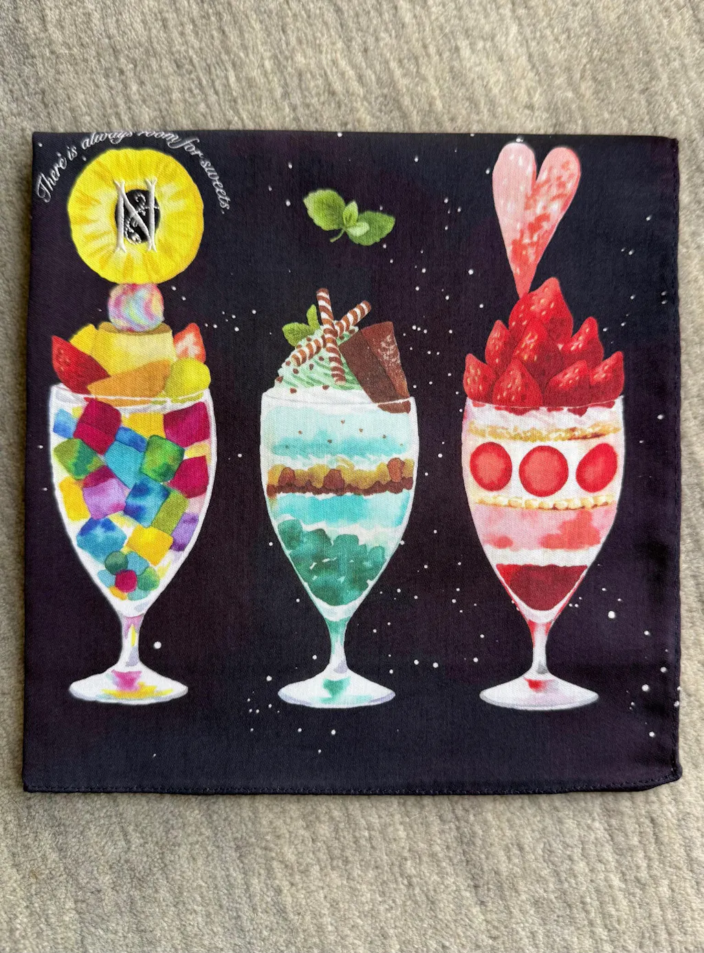 甘酸っぱいイチゴ、ビターなチョコ、爽やかなメロンなど、様々な種類のパフェをデザイン。 「甘いものは別腹」というメッセージが描かれたユーモラスでスイートなハンカチーフ。縁はミシンで細く縫製した千鳥巻きです。