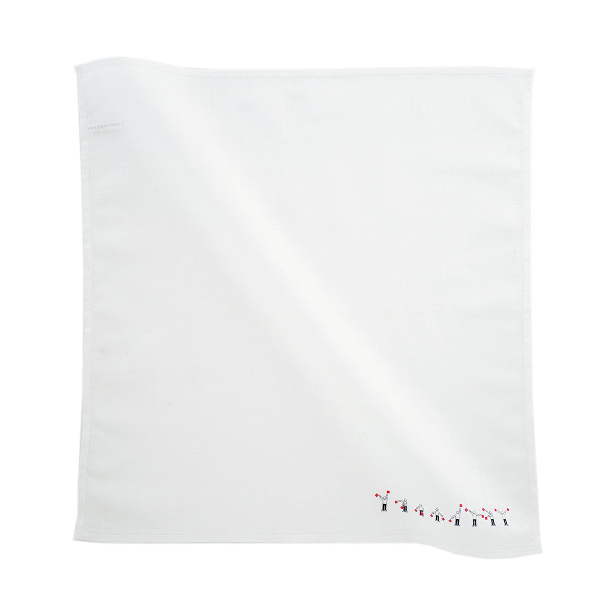 たて糸は綿、よこ糸を麻で織り上げたシンプルで美しい白生地に、ハンドスクリーンで手旗の子たちを丁寧にプリントしました。