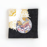 霊獣麒麟と唐草模様に金顔料を使い、煌びやかに表現した勇壮なデザイン。生地には鳳凰柄に織られたジャガード生地を使用。染色は手捺染でしっかり丁寧に。ふちは丁寧に一枚一枚ミシンを使わず手縫いでふっくら立体的に巻き上げております。
